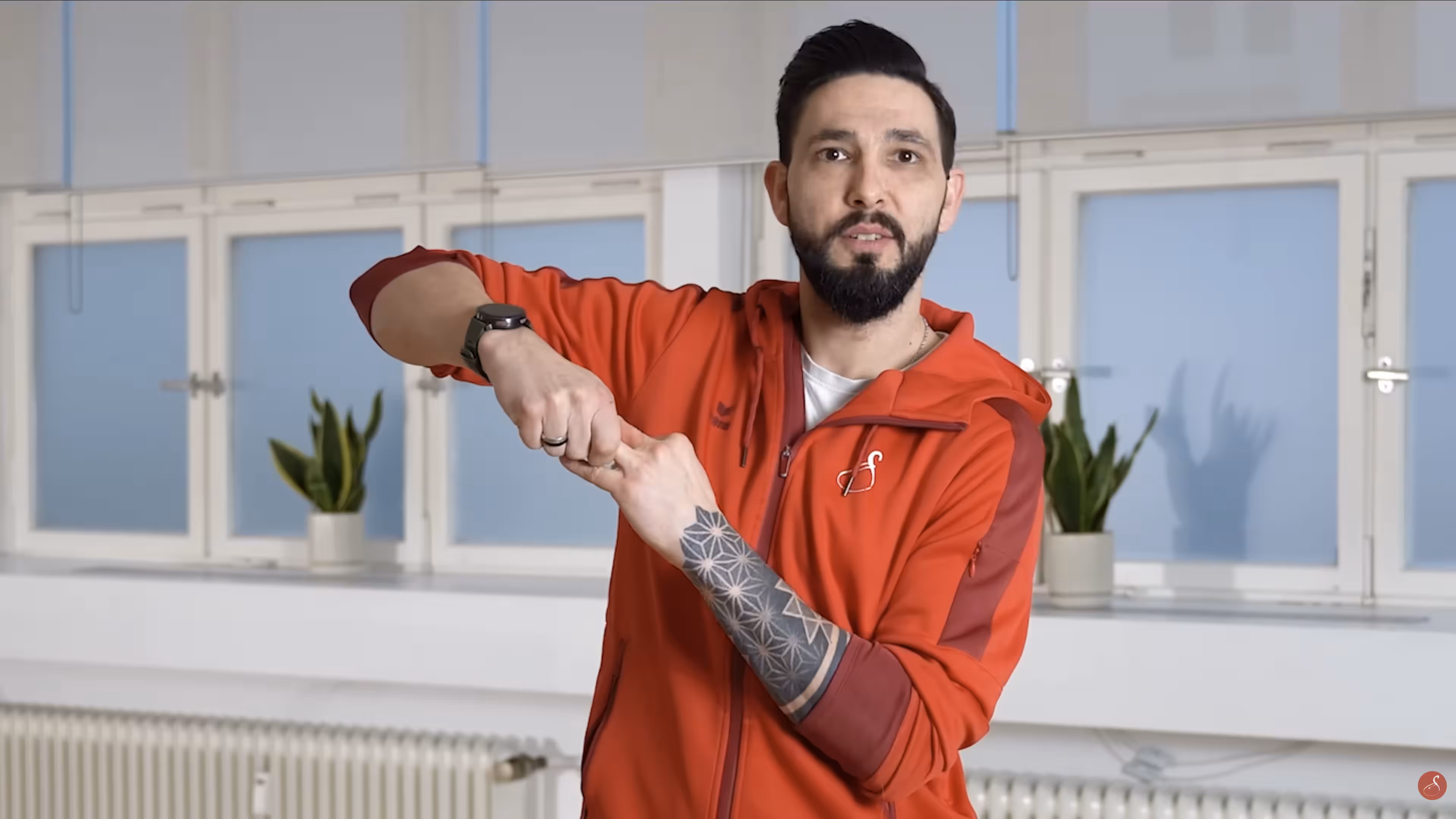 Beginne damit, die Finger eng zu beugen, sodass die Fingerspitzen die Handfläche berühren. Beuge dann die Grundgelenke, um eine Faust zu bilden, und beziehe das Handgelenk in die Beugung mit ein. Kehre die Bewegung um, indem du das Handgelenk streckst, die Faust langsam öffnest, die Finger streckst und sie am Ende abspreizt. Führe die Bewegung fünfmal kontrolliert und langsam aus. Wenn du die Bewegung beherrschst, kannst du die Geschwindigkeit erhöhen.